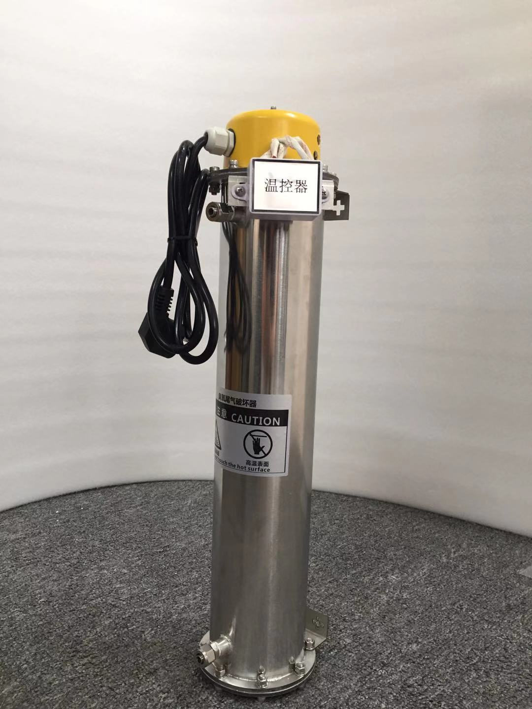 尾氣破壞器設(shè)計(jì)為加熱型。設(shè)備全自動(dòng)運(yùn)行,采用雙層不銹鋼保護(hù)。初次投資和運(yùn)行費(fèi)用均底于活性炭催化式、接觸氧化式。尾氣進(jìn)入反應(yīng)室后,臭氧分子在通過加熱催化器時(shí)得以分解。